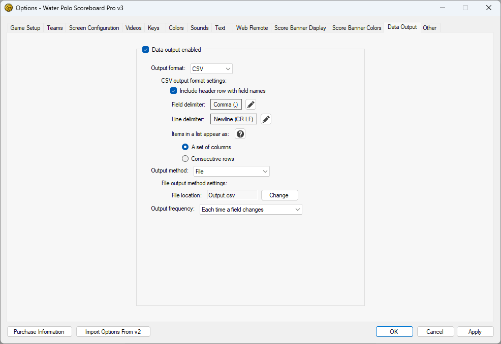 The data output feature allows you to send your live scoreboard data to other systems such as graphic generators.